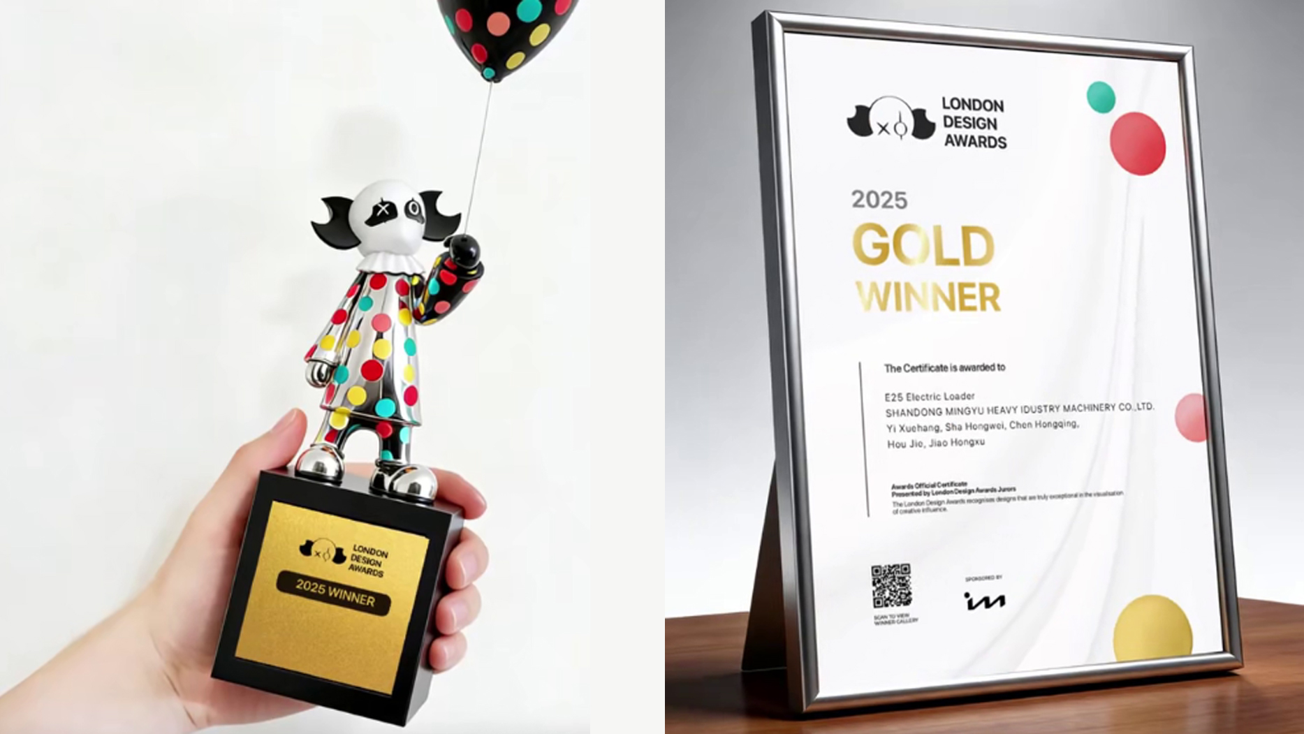Alongside the eye-catching Gold Award trophy (adorned with the event’s signature logo and vibrant polka-dot detailing), Mingyu received an official certificate of recognition, naming the E25 Electric Loader and its design team (including contributors Yi Xuqiang, Sha Hengwei, and others) as 2025 winners. This dual recognition cements the model’s status as a standout in global industrial machinery design.