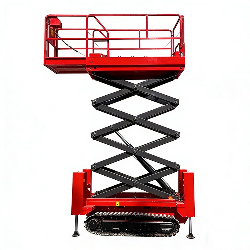 Гусеничная система танкового типа: Оснащена прочными резиновыми гусеницами со стальным усилением, которые равномерно распределяют вес. Это позволяет подъемнику передвигаться по грязным строительным площадкам, гравийным карьерам и естественному грунту без потери сцепления.