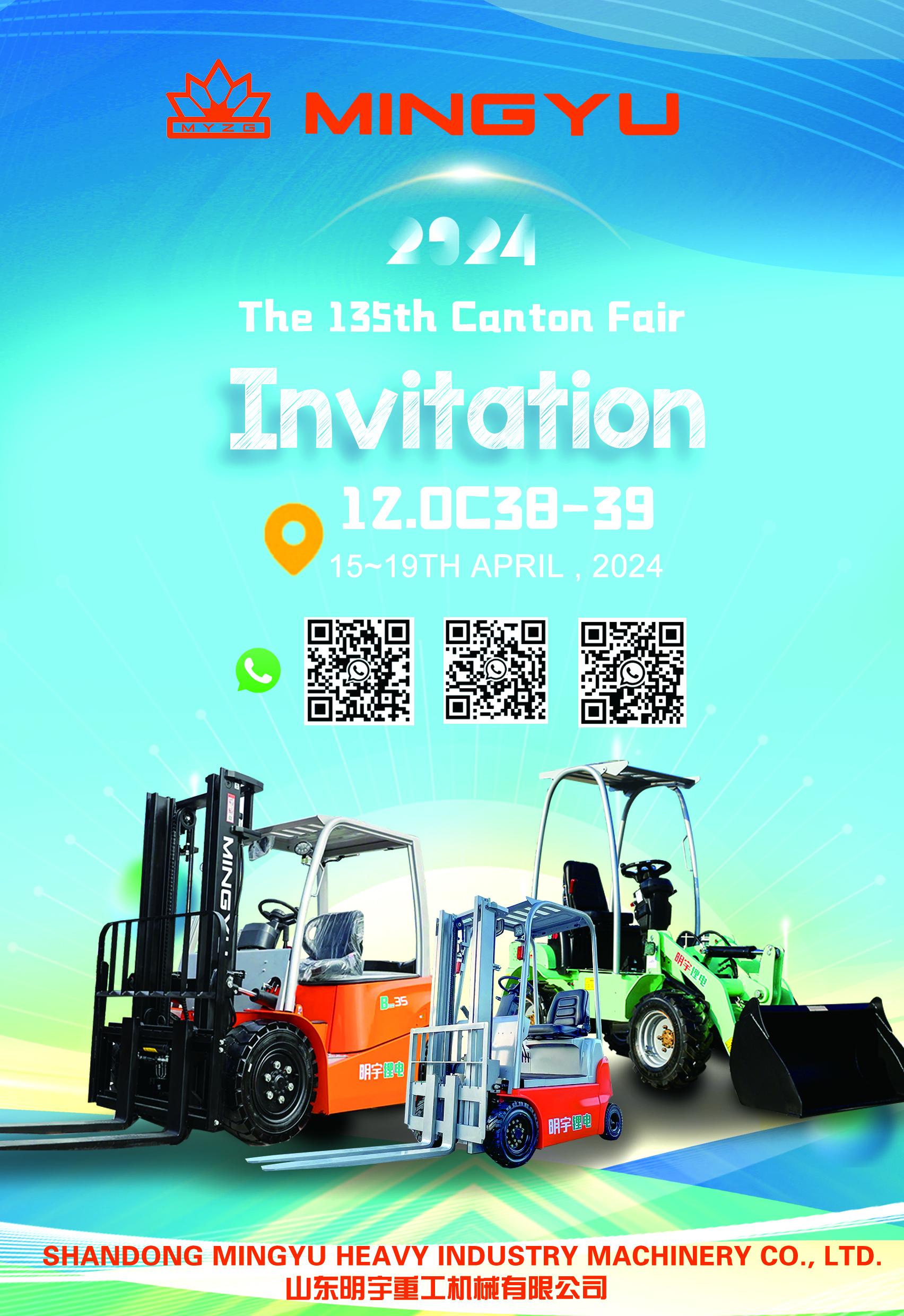 The 2024 Spring Canton Fair will kick off on April 15. Mingyu Heavy Industry Machinery Co., Ltd. welcomes guests from all over the world to participate in the grand event. At this moment, we invite you to plan your schedule in advance to ensure that you can attend this event in person and witness this historic moment with MYZG. 4.15-4.19Booth No.: 12.0C38-39.